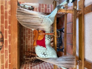 We have had to totally refinish Tiberius as he came to us in a poor state, however we have stayed true to the original look and dappling patterns. He has then had to have a new mane and tail and finally a new set of top quality removable leather tack to finish his look. We have many photographs of him throughout and will of course provide them to his new owner.